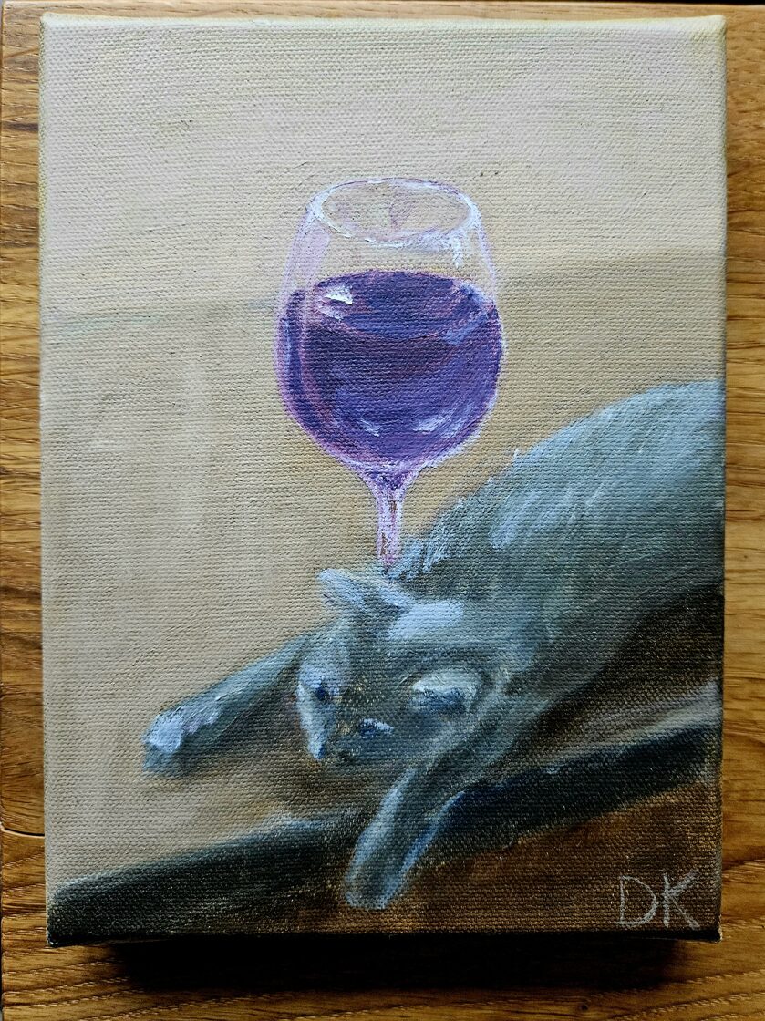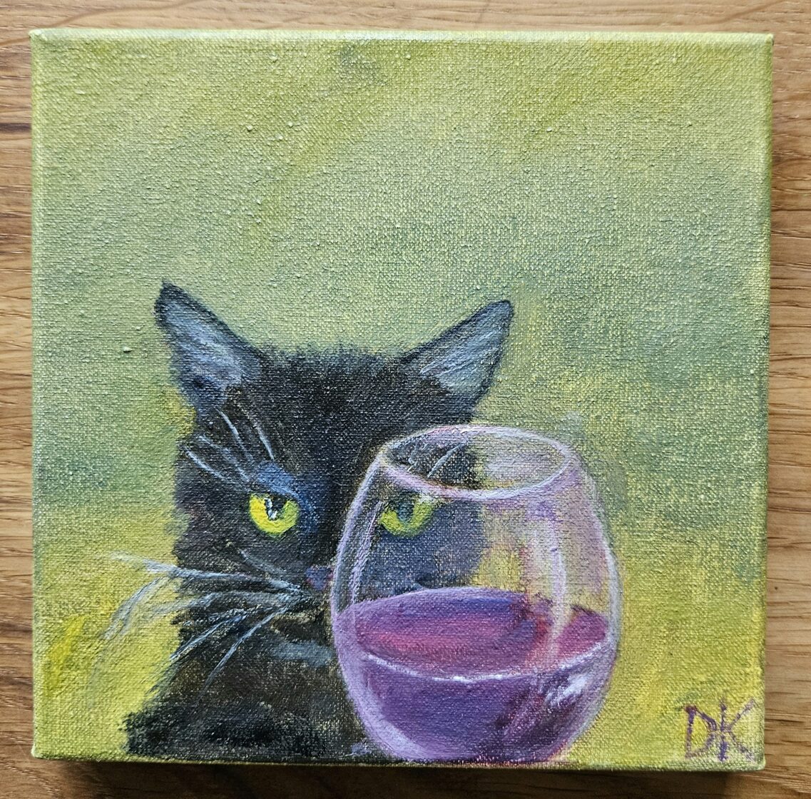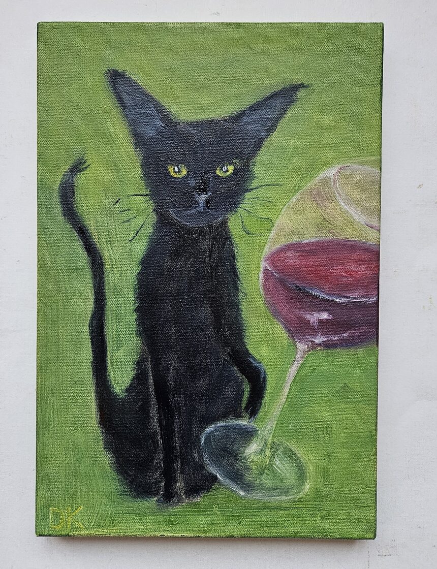 Melnais kaķis ar vīna glāzi. 20 x 30 cm. Audekls, eļļa. 30 EUR. PIEEJAMS -